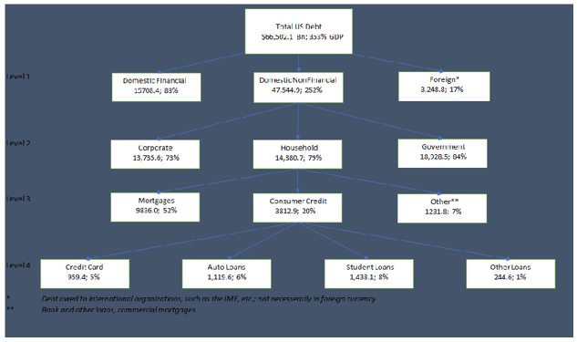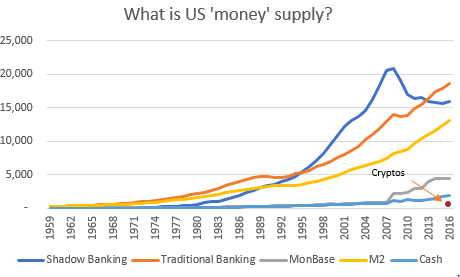 *Shadow Banking Liquidity is defined as the sum of all sectors open market paper, holding companies’ debt and loans, GSE total liabilities, Agencies total liabilities, Issuers of asset-backed total liabilities, money market mutual funds total liabilities, broker-dealers repos; Traditional Banking Liquidity is defined as private depository institutions total liabilities; Cryptos is cryptocurrencies which is not to scale; All numbers in $Bn