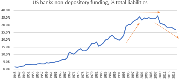 This was not rocket science. But it was the perfect storm that no one wanted to see coming because everyone was enjoying the party. And even though it was not straightforward to see it in the data, there were signs. For example, the chart below shows the non-depository funding (i.e. any other funding but checking and time-deposits which are the most secure ones) of US banks as a % of total assets. In the 1990s there was a spike in banks’ wholesale funding: repos, debt, open market paper, etc. The line flattened thereafter before hitting an all-time high in 2008. After 2008, the banks have continued to move away from wholesale funding in line with the decline of the shadow banking as well as with the new banking regulations.