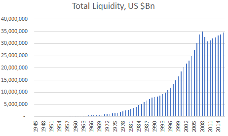 We still have no idea what our money supply is. Shadow banking liquidity continues to decrease and even though traditional money supply has continued to rise, total liquidity now is still just about at the same level as the peak of the 2008 financial crisis (chart below).