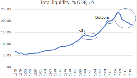 Relative to GDP, the situation looks even worse (chart below). Total liquidity as a % of GDP continues to decrease 8 years after the financial crisis. During the Dotcom crash, it only flattened out, but during the previous debt crisis, the 1990s Savings and Loans Crisis, total liquidity as a % of GDP decreased for about 5 years.