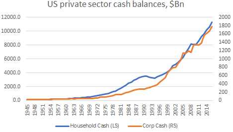 How should we measure monetary liquidity in our modern economy? We know that the physical notes and coins which the Fed and the Office of the Mint in the US, for example, produce is only a small % of the actual money supply (‘Cash’ in the chart at the top of the post). Moreover, we know that this cash is circulated only when the public demands to exchange its digital money for physical ones. The 2008 financial crisis has also finally taught us that majority of the money created is done by the ‘private’ banks in the process of loan origination (‘Traditional Banking’). Some people, however, are still confused with the base money creation by the central banks (‘MonBase’), calling it ‘printing money’. These excess reserves at the Fed, for example, are nothing but a monetary ‘cemetery’. They are stuck there, unable to enter the real economy unless new debt is created.