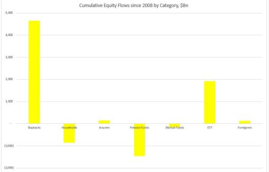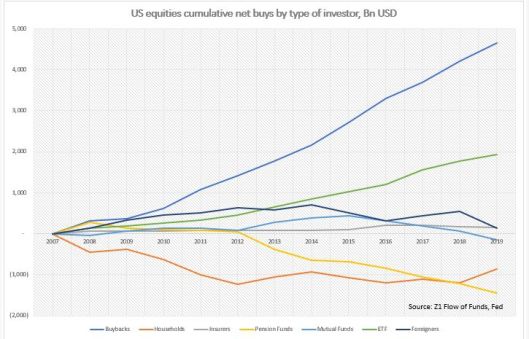 What followed was a spur of financialization, share buybacks and frantic M&A activity, all in line with finding innovative ways to reward shareholders. This resulted in a drastic decline in publicly traded US companies and the âoligopolizationâ of US economy. Something which was undeniably good for shareholders became also questionably not so good for the economy and for everyone else, who is not a shareholder. In fact, the percentage of Americans who own shares in publicly traded companies has also declined in the process.