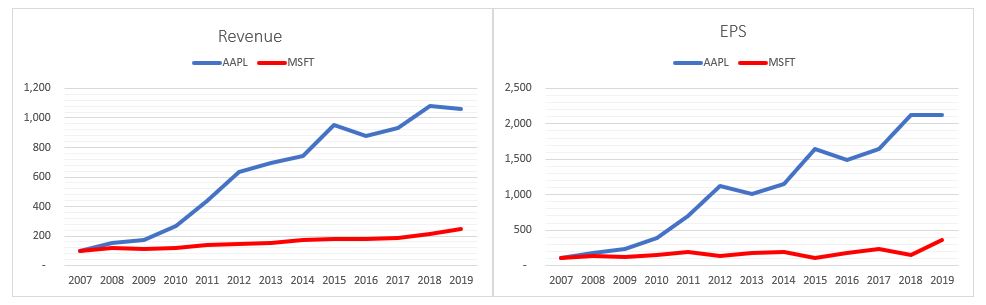 Since 2007 Apple has outperformed Microsoft in both Revenue growth (former’s increased 10x, latter’s – about 2.5x) and EPS growth (20x increase vs. 3.5x). In 2007 Apple’s revenue was about half of Microsoft’s. In 2010 they were the same. Today Apple’s revenue is more than 2.5x bigger than Microsoft’s, however it topped in Q3’2018, while Microsoft’s is still growing.