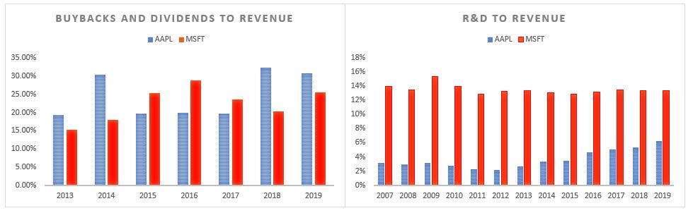Apple only started paying dividend in 2010 and buying back its stock in 2011. Since then, both have spent about 25% of their top-line revenues, on average, on shareholders payouts. However, Microsoft spends considerably more on R&D as a % of revenue than Apple.