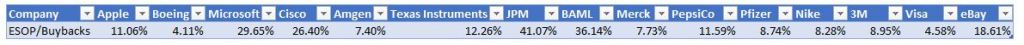 If we take the 20 largest share buybacks programs and look at the same period 2011-2018 which also Yardeni data covers, employee stock compensation is only about 14% of the value of the corporate share buybacks. The ratios vary from company to company but just to give you an example, for Apple, which has, by far, the largest share repurchase program of all companies in the US, employee stock compensation is on average about 11% of total buybacks. The banks have the largest ratio, at around 35%, while Boeing and Visa have the lowest, around 4%.