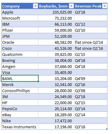 In fact, for majority of the companies in that sample, their revenues had peaked already some time ago. That did not stop companies continuing with their share buyback programs. In fact, some like Apple, Cisco, Amgen, BAML, Merck, Pfizer have substantially increased their spend on share buybacks thereafter.