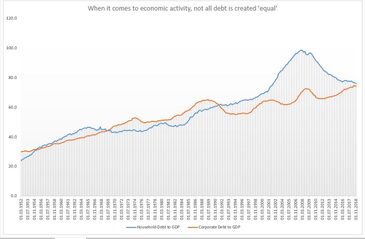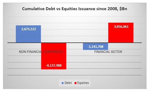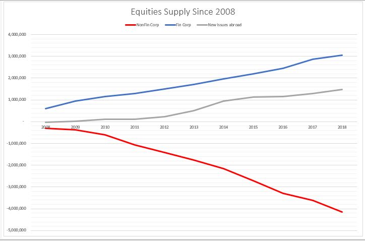 In other words, non-financial corporates have bought back their shares at the expense of issuing debt, while the financial sector (ETFs) has issued equities and reduced their overall indebtedness.