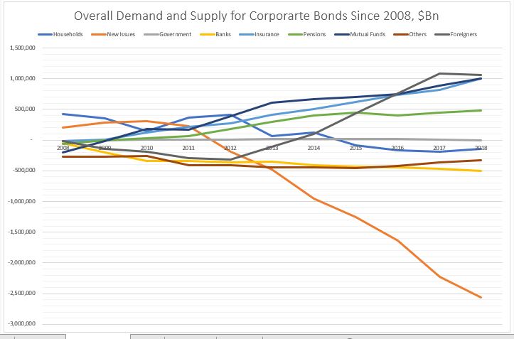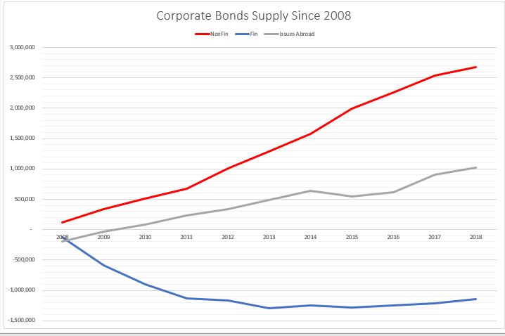 The opposite is happening on the corporate supply side. Non-financial corporates have done the majority of the issuance while the financial sector has deleveraged (reduced debt liabilities).