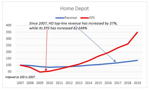 Since 2007, Home Depot’s top-line revenue has increased by 37%, while its EPS has increased by 249%, almost 7x more.