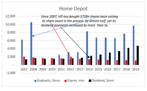 Since 2007, Home Depot has bought $72Bn shares back, one of the largest share buyback programs out there, cutting its share count in the process by almost half; yet its dividend payments increased by more than 3x.