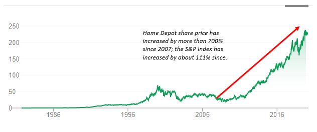 And the cherry on the cake: Home Depot’s share price has increased by more than 700% since the end of 2007; the S&P Index has increased by about 111% since then.
