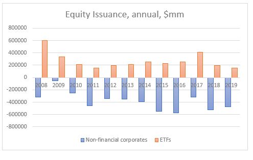 Actually, in 2019 households bought the most equities direct since the crisis. Foreigners and mutual funds, on the other hand, sold the most equities since the crisis. And equity issuance was the most negative (in the chart below, it is shown as a positive number to signify equity share buybacks).