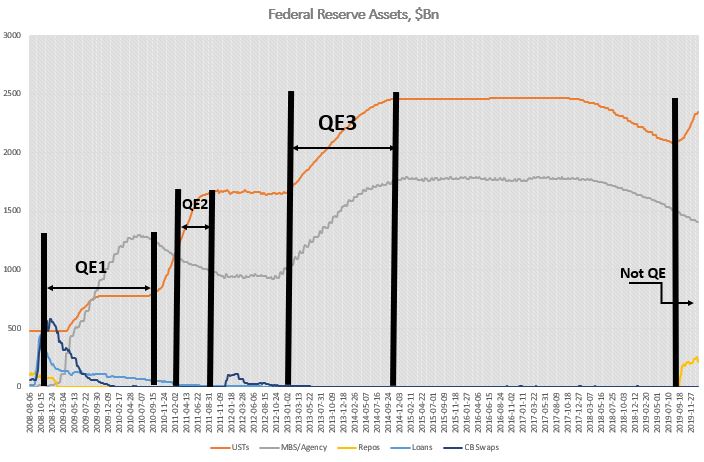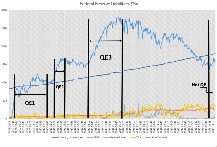No, you can’t call whatever the Fed has been doing so far, starting in September 2019, QE. There are simply no comparisons with any of the previous QEs: The largest increases on the Fed’s balance sheet in 2019 was T-Bills and repos; the Fed never bought T-Bills or engaged in repos in any of the previous QEs – the asset mix was totally different. On the liability side, while in the QEs almost all of the increase went directly into bank liquidity, in 2019 only 50% did. FRRP was more or less unchanged, at around $100Bn between QE1 start and the end of QE3 – by September 2019 it had tripled! TGA averaged around $60Bn before the end of QE3; thereafter the average increased 4x!