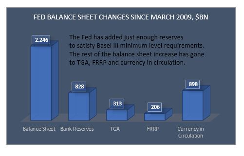 Finally, one has to take into account that banks’ reserves needs have also substantially increased since the 2008 financial crisis on the back of Basel III requirements. According to the Fed itself, the aggregate lowest comfortable level of reserve balances in the banking system ranges from $600Bn to just under $900Bn. At $1.6Tn currently, there is not much excess liquidity left in the system. In fact, banks Fed deposits were already at around $800bn in March 2009. Given that most of the regulations were implemented thereafter, one could claim that no additional liquidity was really added to the banking system since.