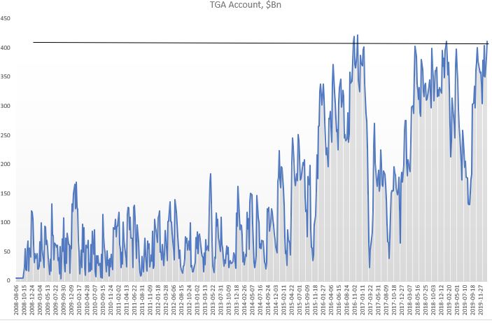 However, not all of that increase went towards interbank liquidity. In fact, only about 50% of that increase ($198Bn) went towards bank deposits. The TGA account increased by $167Bn; that drained liquidity. Reverse repos decreased by $20Bn (FRP by $17Bn and others by $3Bn), which added liquidity. Finally, $37Bn went towards the natural increase in currency in circulation.