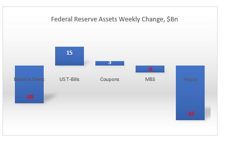 Total assets down $30Bn: the biggest weekly decline since May 1, 2019, and down $27Bn from peak on Jan. 1, 2020. All of the decline is on the back of repos, down $43Bn on the week, and 70Bn from peak. At $186Bn, repos were last time here in mid October 2019.