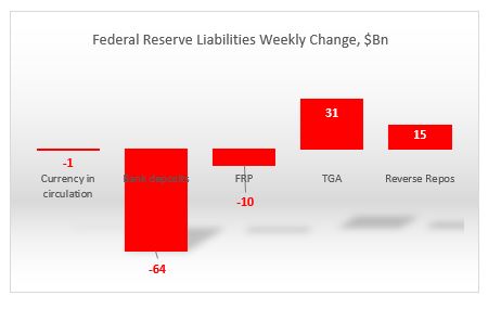 On the liability side, bank reserves declined by $64Bn. But the liquidity dropped more because both the TGA and domestic reverse repos rose by $31Bn and $15Bn respectively. At $412, TGA is at its highest level over the last 12 months. On the other hand, and as expected, FRP continues to decline and at $250Bn is close to the low end of the 12m period. Currency in circulation also dropped for third week in a row, posting the biggest cumulative decline from its peak over the last 12m. The decline in FRP and currency in circulation cushioned the otherwise drop in overall liquidity.