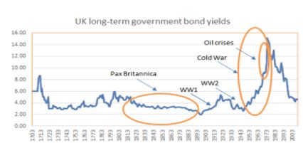 At the same time, wars, conflicts, or even big natural disasters, deplete the capital stock and force interest rates to rise. Sometimes, when these negative supply shocks turn out to be ‘one-off’ occurrences (the 1970s oil crises), we could get just a spike in interest rates; sometimes, if the conflict persists, the increase in interest rates can last much longer (the Cold War).