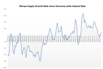 Indeed, if one calculates the above equivalent rates for the period 1980-2007 only, the situation would be even more extreme (see chart above). In fact, until the late 1990s, money supply growth had been pretty much consistently below the economy-wide interest rate. Only after the dotcom crisis, but really after the 2008 crisis, money supply growth rate picked up and stayed on average above the economy-wide interest rate.