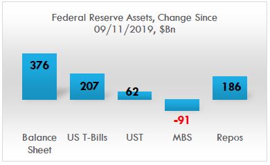Fed actually started increasing its T-Bills and coupons portfolio already in mid-August, three weeks before the repo spike. Part of that increase went towards MBS maturities. But by the end of August, Fed’s balance sheet had already started growing. By the third week of September, also the combined assets portfolio (T-Bills, coupons, MBS) bottomed out, even though MBS continued to decrease on a net basis.