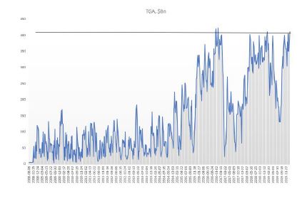 Going forward, it is very likely that the bulk of the increase of the central bank’s balance sheet is behind us for the moment, ceteris paribus. The Fed will continue shifting from repos to T-Bills and probably coupons (especially if it hikes the IOER/repo rate, as expected). The effect on liquidity will depend on the mixture of liabilities, though. I expect the TGA to start drifting lower with seasonality as well as because it is at level associated with reversals in the past.