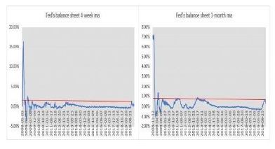 So, while the Fed’s liquidity injection since last September was substantial relative to the period when the Fed was tapering (2018) or when the balance sheet was not growing (2015-17), it is a stretch to make a claim that this is the greatest liquidity boost ever. The charts below show the 4-week and 3-month moving average percentage change in the Fed’s balance sheet. The 4-week change in September was indeed the largest boost in liquidity since the immediate aftermath of the 2008 financial crisis. The 3-month change, though, isn’t.