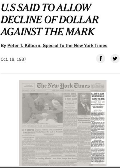 Some people have mentioned to me that a new Plaza Accord is needed. I am not so sure. In my opinion, it would be counterproductive. From a behavioral point of view, a weak dollar is not necessarily beneficial for US assets given that a big chunk of them is owned by foreigners. Just like a worsening of the dollar funding terms may push these people to sell, so could an attempt to substantially weaken the dollar. We shouldn’t forget a small but very much overlooked fact of the 1987 stock market crash: on the weekend before Black Monday, the US Treasury Secretary threatened to devalue the dollar.