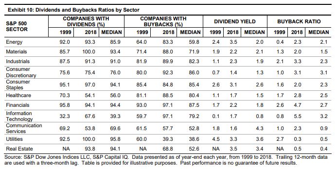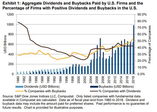 Since 1997, the total amount of buybacks has exceeded the cash dividends paid by U.S. firms. The proportion of dividend-paying companies decreased to 43% in 2018 from 78% in 1980, while the proportion of companies with share buybacks increased to 53% from 28%.Â