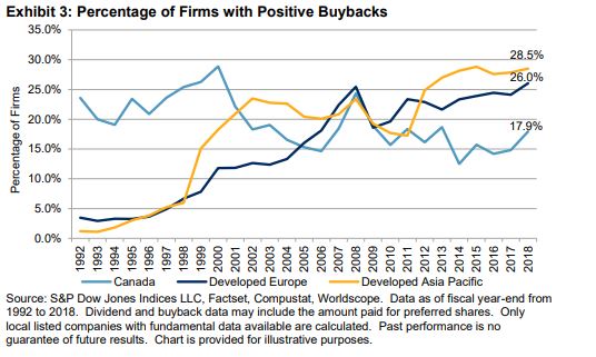 Compare to other developed markets. Despite an increase of share repurchases in Europe and Asia, as a % of all companies, buybacks still stand at about half that in the US. On the other hand, fewer Canadian companies engaged in share buybacks during that period.Â