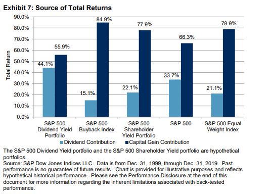 Reality is that “buybacks tend to follow the economic cycle with increased or decreased repurchase activities in up or down markets while dividend payouts are normally more stable over time, the S&P 500 Dividend Yield portfolio tends to outperform in down markets, while the S&P 500 Buyback Index may capture more upside momentum during bull markets.“