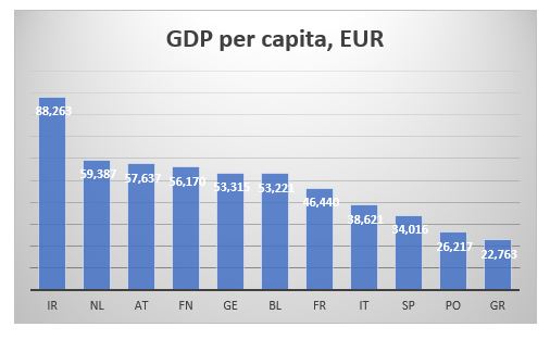 To measure wealth across countries, economists normally use GDP per capita. This is how some of the major EU countries rank according to this measure.