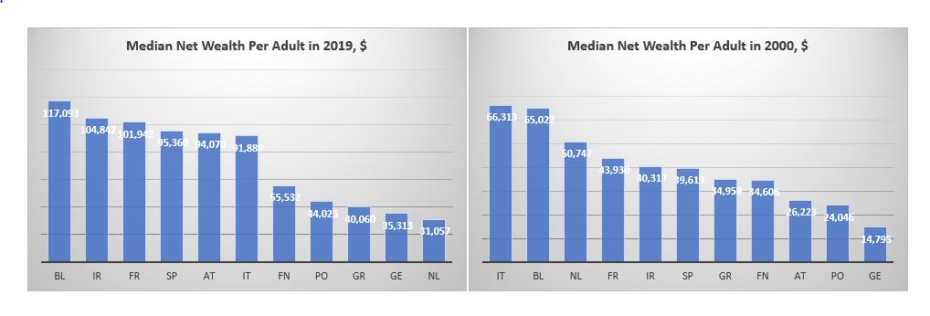 The two data sets give a slightly different view. Looking at the mean net wealth, the bottom three countries in 2000, Finland, Greece and Portugal, are still the bottom three countries in 2019, though in slightly different order. The Netherlands was the wealthiest country in both 2000 and 2019. However, the top three in 2000 was also comprised by Italy and Belgium, while in 2019, they were replaced by France and Austria.
