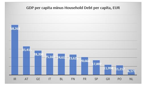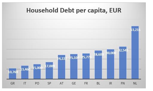 The Mediterranean countries are better off than the core and the north as they have much less household debt per capita. This might be almost counterintuitive: the more assets one has, the more liabilities, they might also have.