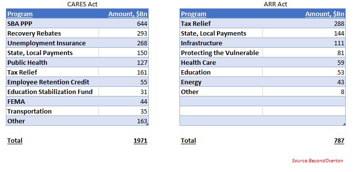 The Coronavirus Aid, Relief, and Economic Security (CARES) Act of 2020 is much bigger than the American Recovery and Reinvestment (ARR) Act of 2008, both in absolute terms and in percentage of GDP.
