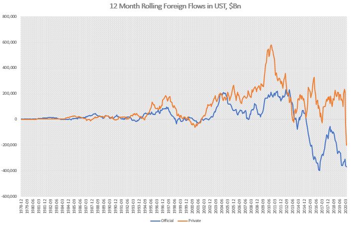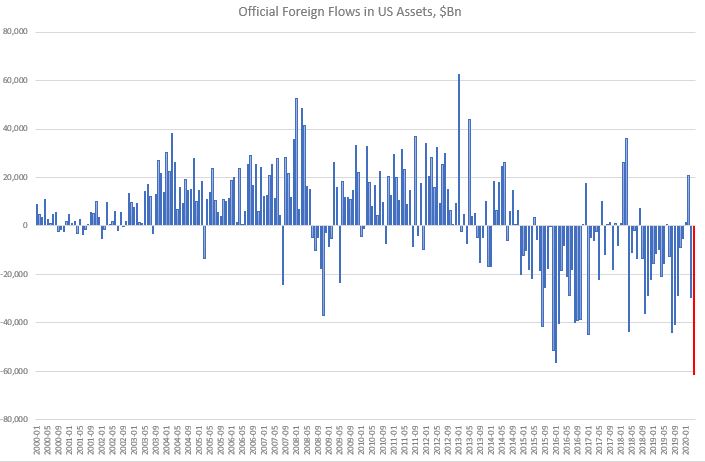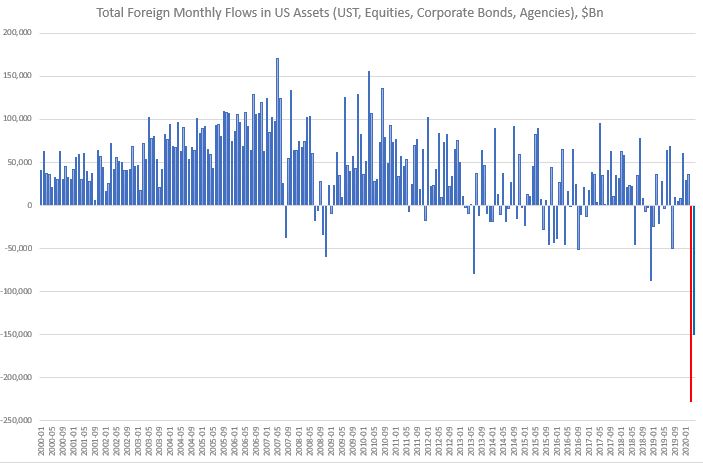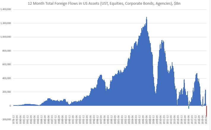 This is significant because the 12-month rolling cumulative total foreign flow in US turned negative by a large amount. This is very, very unusual.