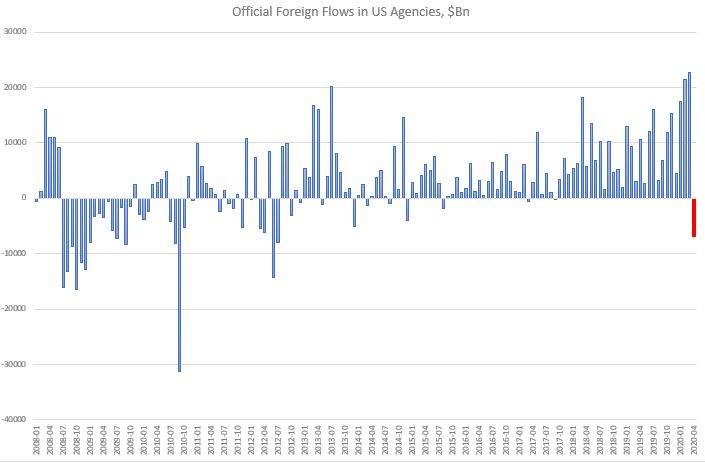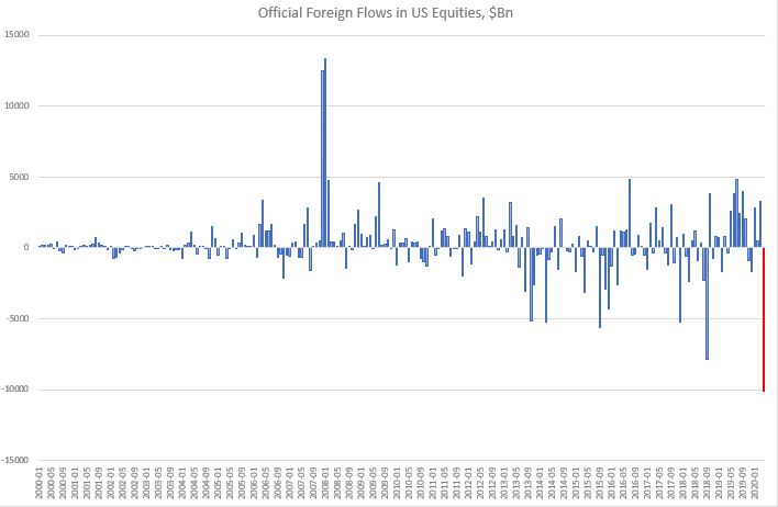 On the US equities side, unlike in March, though, this time foreigners were net sellers. The total outflow was not that large by historical standards, but the official foreign outflow was.