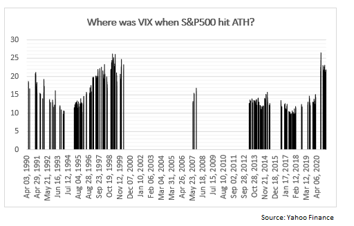 The years preceding 1997 were characterized with much lower levels of VIX, just like the years preceding 2020. In fact, the lowest VIX to coincide with SPX hitting ATH was on November 3, 2017 at 9.14. Average historical VIX to coincide with the index hitting ATH is 14.92.