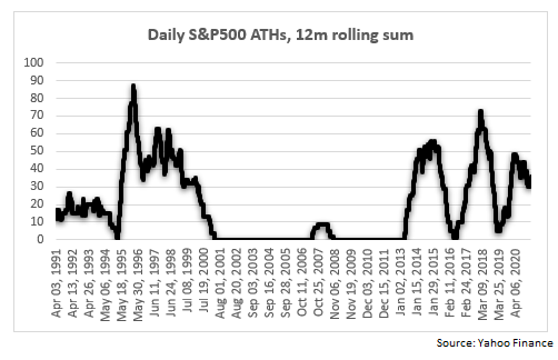 Since 1990 there have been a total of 614 ATHs for the SPX. Most daily ATHs on a 12m rolling basis were 87 reached on February 12, 1996. The average is around 20. In 2020 we had 33 ATHs, so far this year we have had 16.