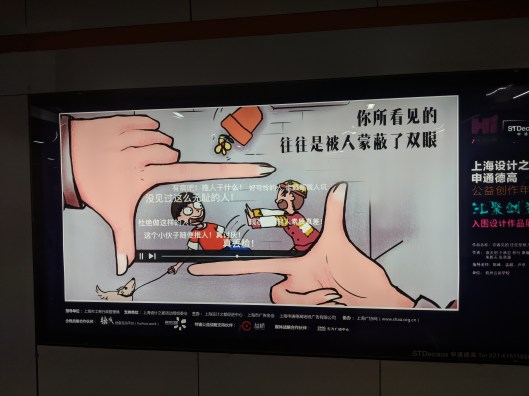 This was our second visit here, even though I barely remember anything from the first: just like Xi’an and Beijing before, the city had profoundly changed. We stayed in a hotel not too far from the Bund – when it comes to skyline, this is still one of the most impressive sights I have seen.While Beijing was about sightseeing, Shanghai was about immersing ourselves in the city and discovering its peculiarities as much as possible. So we did our laundry in a local “Speed Queen”, my daughter got a haircut. We took the Metro or just walked everywhere (looking for the cheapest pomelo!). For a country so prone to planning and doing a lot by ‘order’ historically, and now recording everything its citizens do, I was curious to see these pictures in the metro.