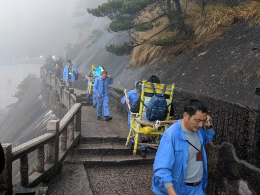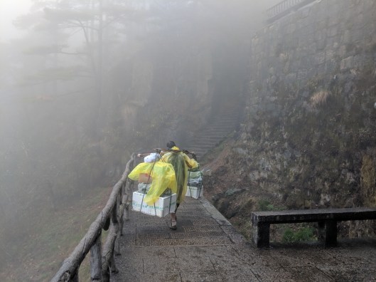 And second, I was totally impressed by these people bringing stuff for sale in the various kiosks up in the mountains: I did not realize it in the beginning, but they were not using the gondolas (which were very expensive – 80 CNY one way) but instead they climbed at least 7 km up a very steep path all the way from the bottom.