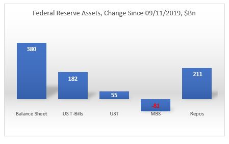 Fed has indeed been doing more than $100Bn worth of repo operations on a daily basis recently, but those operations are only temporary, i.e. they can not be taken cumulatively in ascertaining the effect on liquidity. In fact, the Fed’s balance sheet has increased by $380Bn, and only 55% of which came from O/N and term repo operations ($211Bn). The other 45% came from asset purchases. On the asset purchases, the Fed bought mostly T-Bills ($182Bn), some coupons ($55Bn) while letting its MBS portfolio slowly mature (-$81Bn).