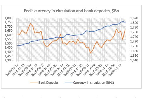 Finally, while currency in circulation naturally increases with time, bank deposits also bottomed out the week the Fed started the repo operations in September, but strangely enough, they topped the first week of December (for the time being).