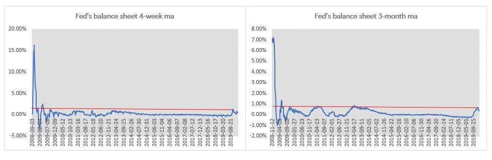 So, while the Fed’s liquidity injection since last September was substantial relative to both the decrease in liquidity before that (starting in 2018 when the decrease in the Fed’s balance sheet became consistent) and, to a certain extent, since the end of the 2008 financial crisis, it is difficult to make a claim that this is the greatest liquidity boost ever. The charts below show the 4-week and 3-month moving average percentage change in the Fed’s balance sheet. The 4-week change in September was indeed the largest boost in liquidity since the immediate aftermath of the 2008 financial crisis. The 3-month change though isn’t.