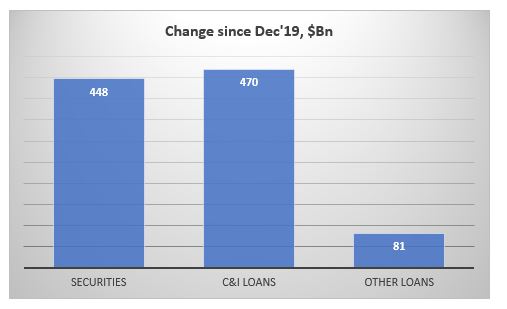 Of those bank credits, actually, only about half are loans, the other half are securities. So, in fact loans have created only about 1/6 of the money supply YTD (would be even less if measured after the Fed/Treasury initiated their programs in March).