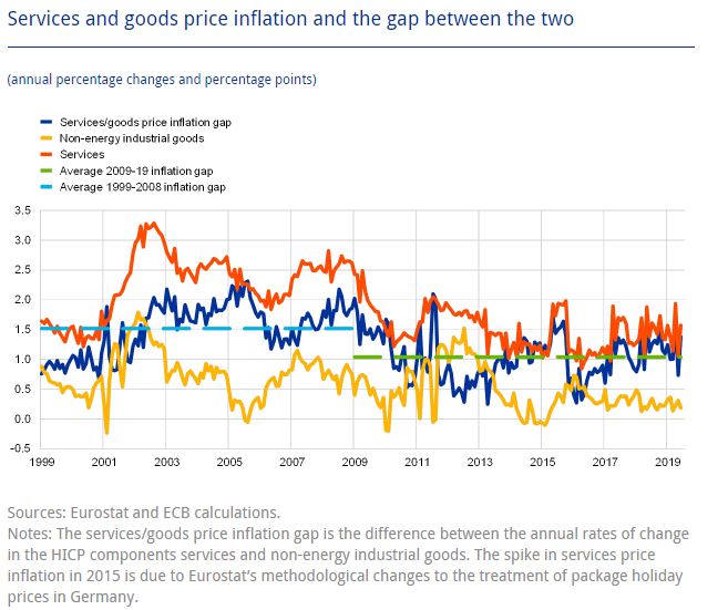 Services price inflation tends to be much higher than manufacturing price inflation. This paper from the ECB has documented that this is a feature for both EU and US economy and has been prevalent for the past 20 years.