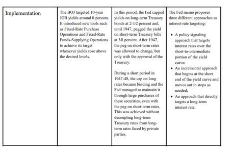 “hard” vs. “soft” targets: the former would require the Fed to keep yields at a specific level all the time, while under the latter, yields would be adjusted on a periodic basis.