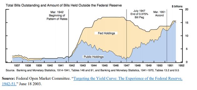 Under the peg, the Fed, instead, had to buy whatever the private sector sells as long as yields were above the stipulated levels. Naturally, investors were riding the positively sloped yield curve, selling the front end and buying the long end. The Fed was forced to accumulate a lot of T-Bills as a result.
