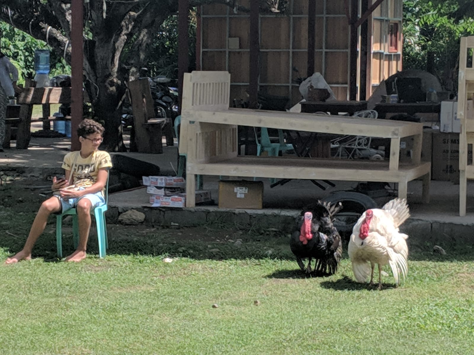 In Dumaguete, we got picked up by the owner of our guesthouse which was a little group of houses around a garden, sometimes guarded by a duo of turkeys.